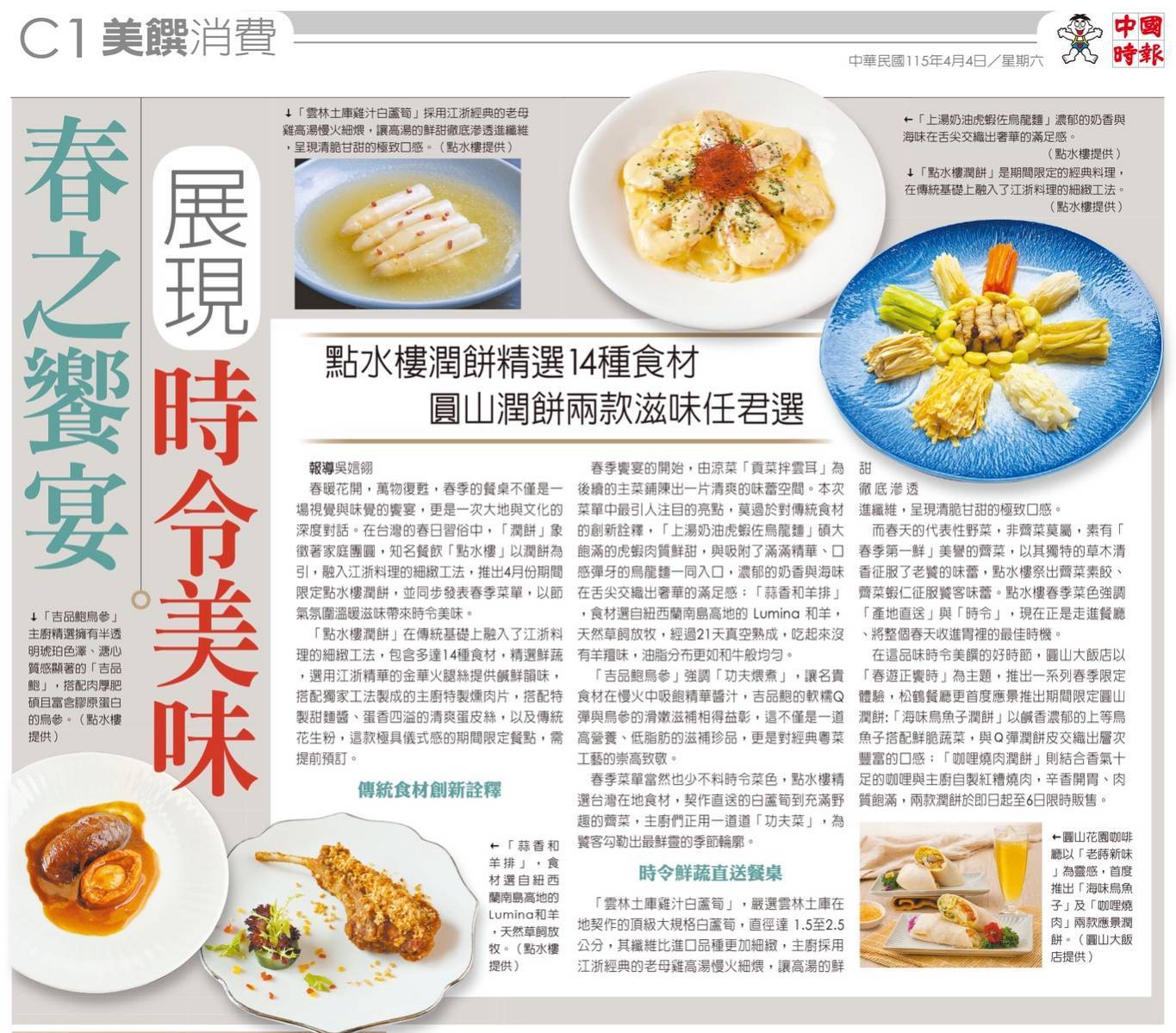 1. 2026.04.07 【感謝媒體報導】主廚到你家 年菜外賣神救援   2. 2026.04.01 尋味清明,捲進江浙細緻,點水樓潤餅上市囉~